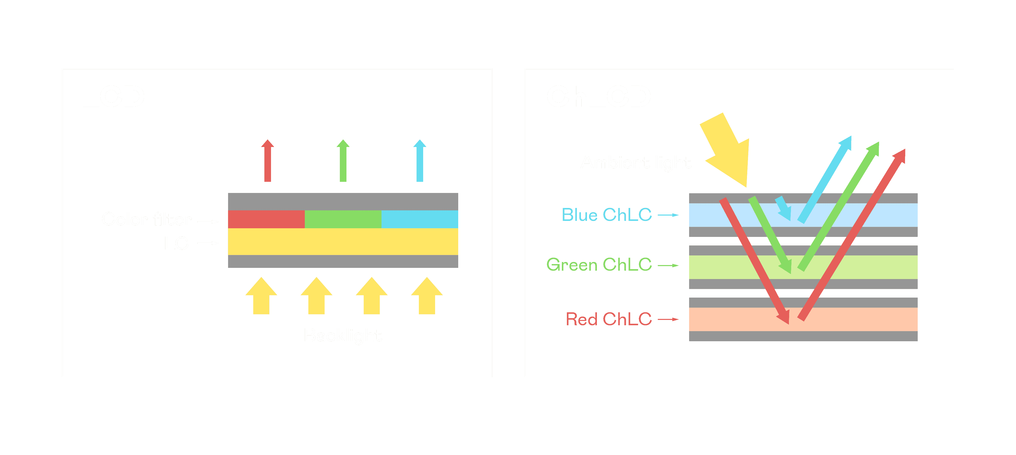 ChLCD 胆固醇液晶就如同纸张一样,,,透过反射环境光来显示影像,,因此长时间观看不易造成人眼视觉疲劳,,可达到护眼效果。。。。当处于户外阳光下使用,,LCD 影像容易失真而不易观看,,,但胆固醇液晶仍可维持较佳的影像品质。。。