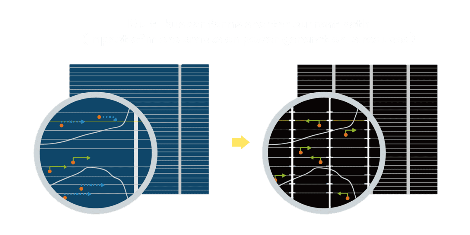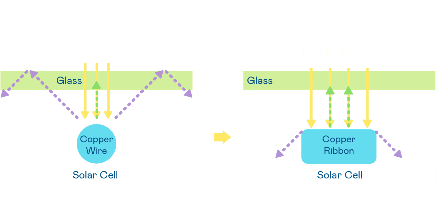 - 电池使用多条铜导线 (Copper wire) 于电池片上形成较短的电流路径,,,,提高电流收集效率,,,采用圆形设计的铜导线较传统扁平式的铜焊带 (Ribbon),,可增加入射至电池的光线量。。